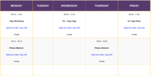 | 09:30 - 11:00 Yoga Stretching Salle de la Mer, Cap d'Ail Anette | 09:15 - 10:45 Yoga Stretching Salle de la Mer, Cap d'Ail Anette | 09:30 - 11:00 Yin Yoga Relax Salle de la Mer, Cap d'Ail Anette |